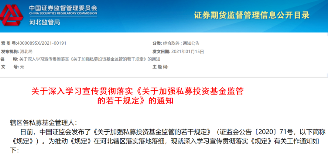 《規(guī)定》發(fā)布后,河北、海南等多地證監(jiān)局也陸續(xù)發(fā)布通知,要求轄區(qū)內各私募基金管理人全面學習《規(guī)定》,并按照要求進行全面自查和整改。